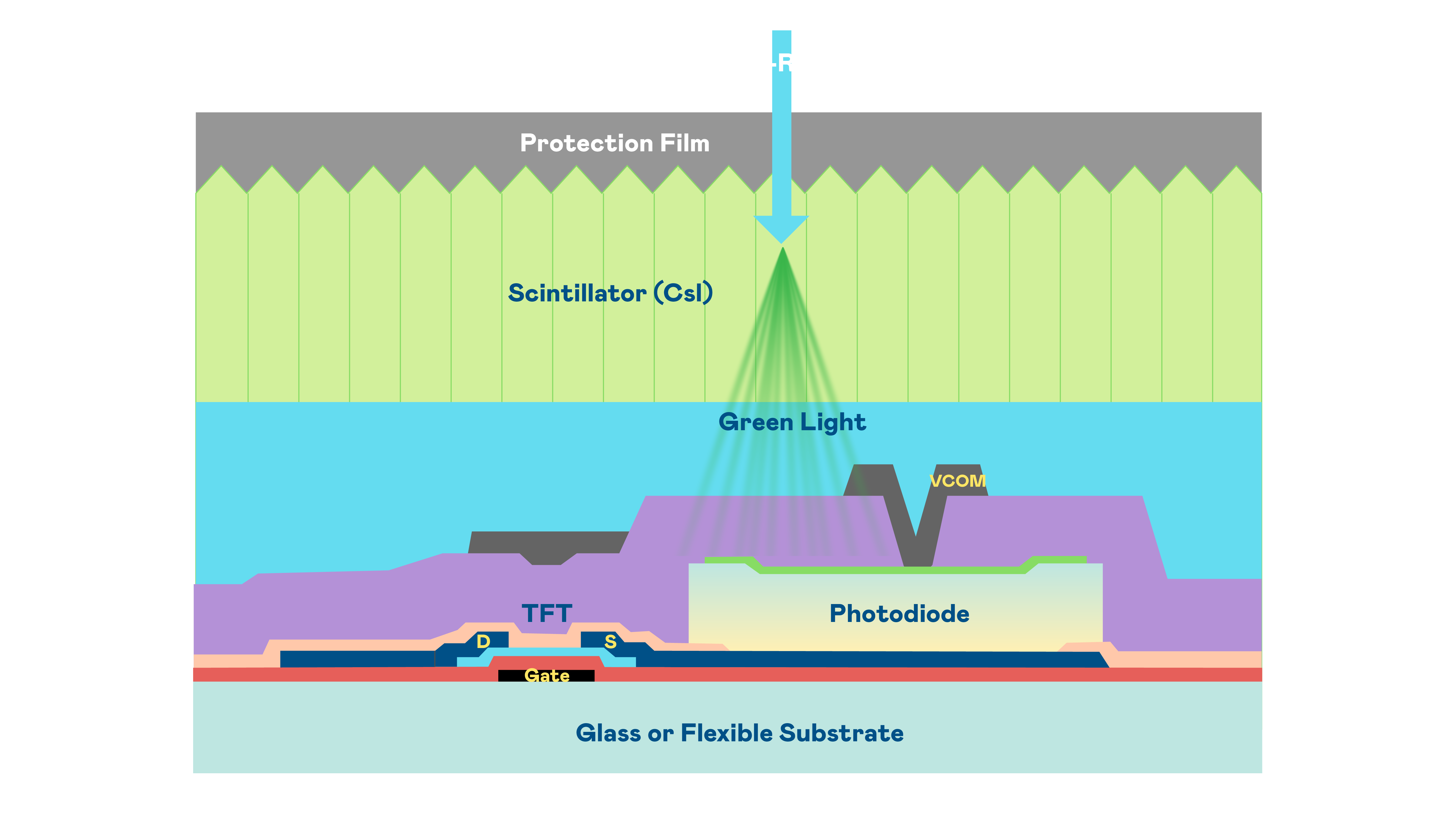 征途国际的X光影像感测阵列使用薄膜电晶体 (TFT) 作为每个像素的读取开关,搭配光电二极体(Photodiode)的光电转换元件,用以感测X光影像讯号。